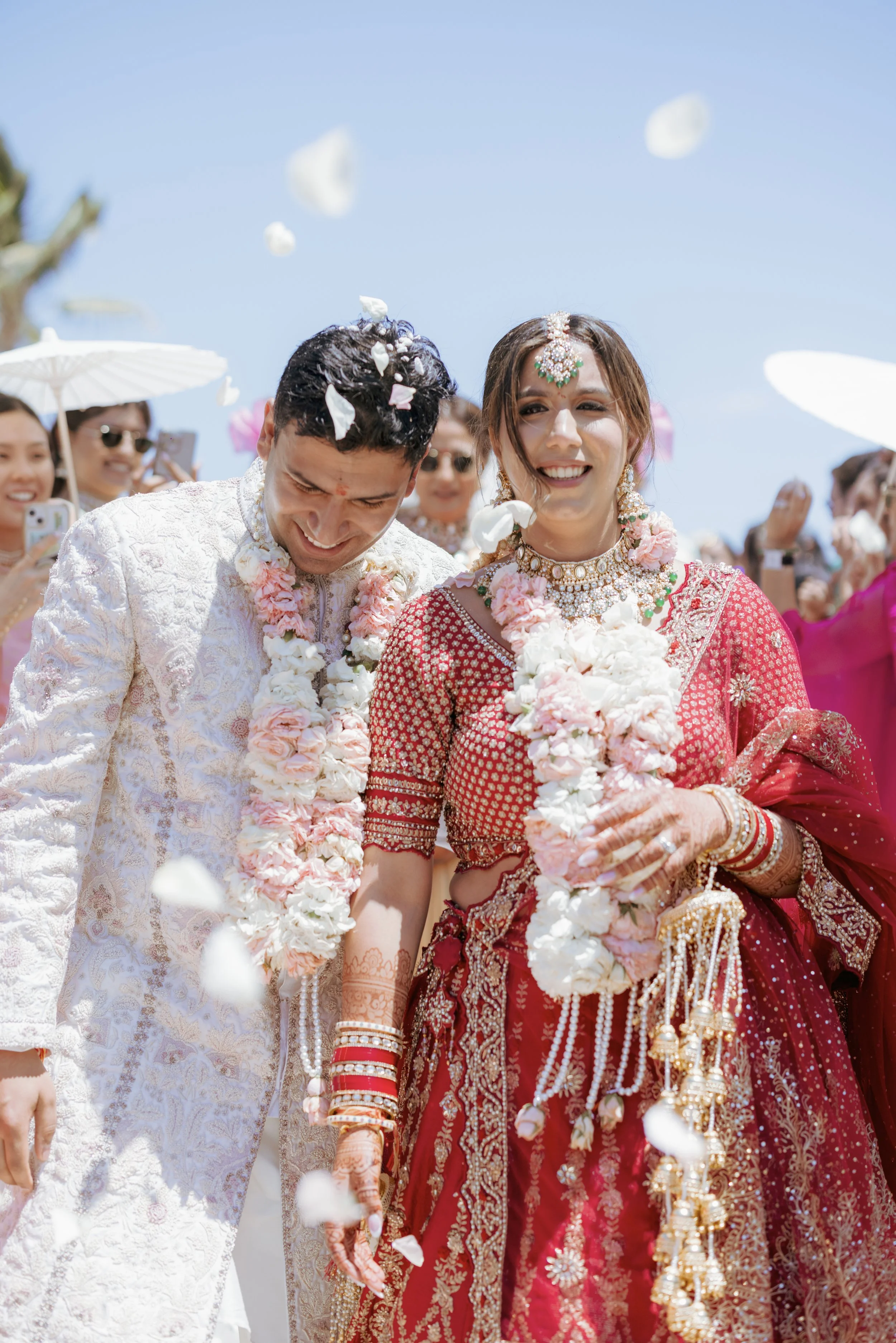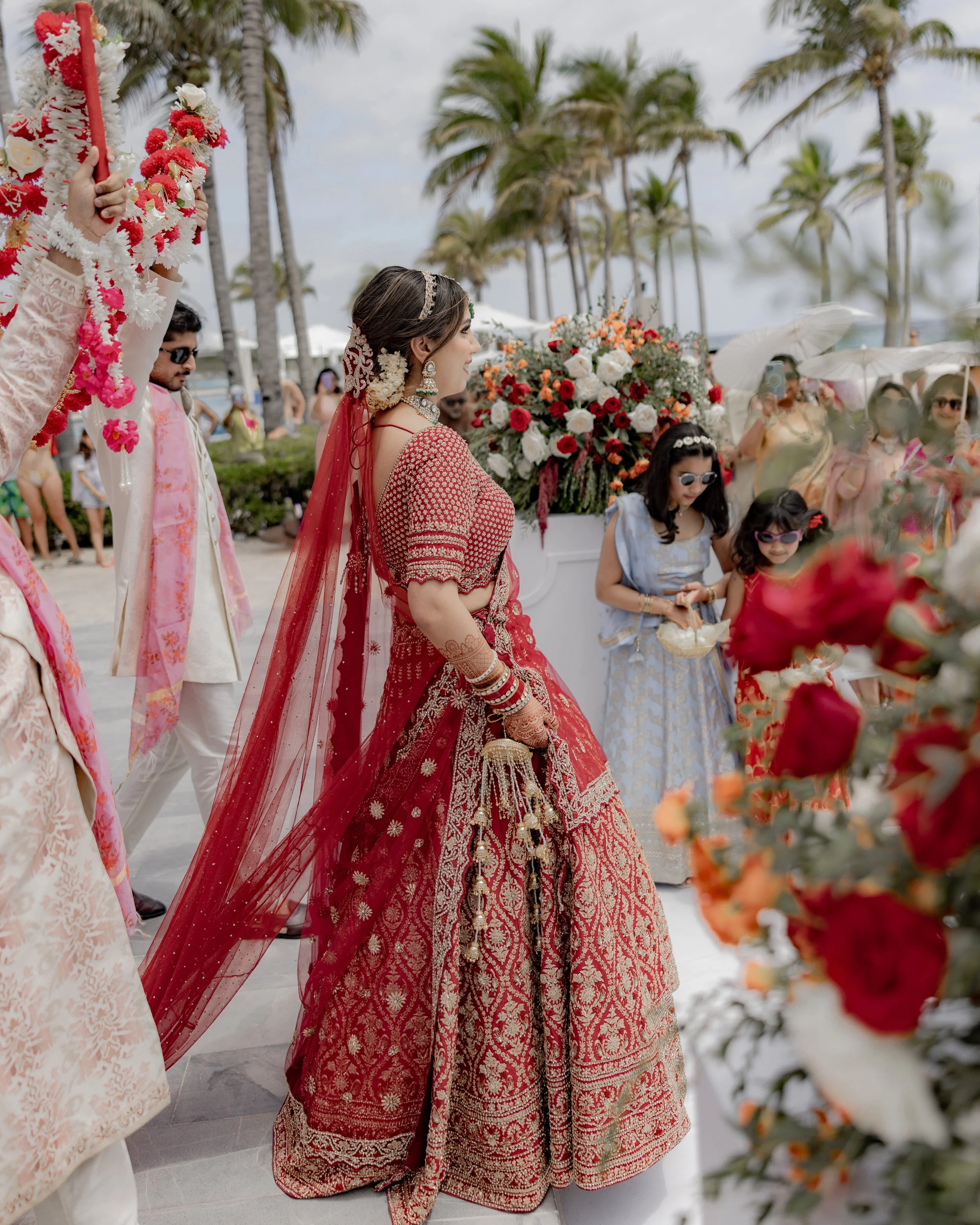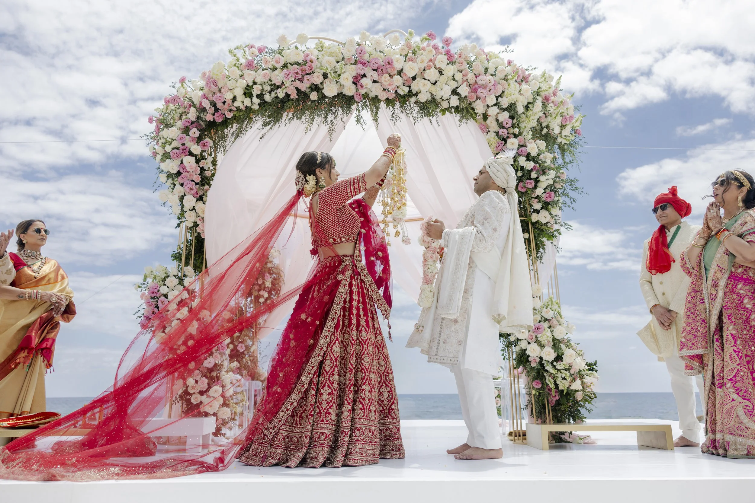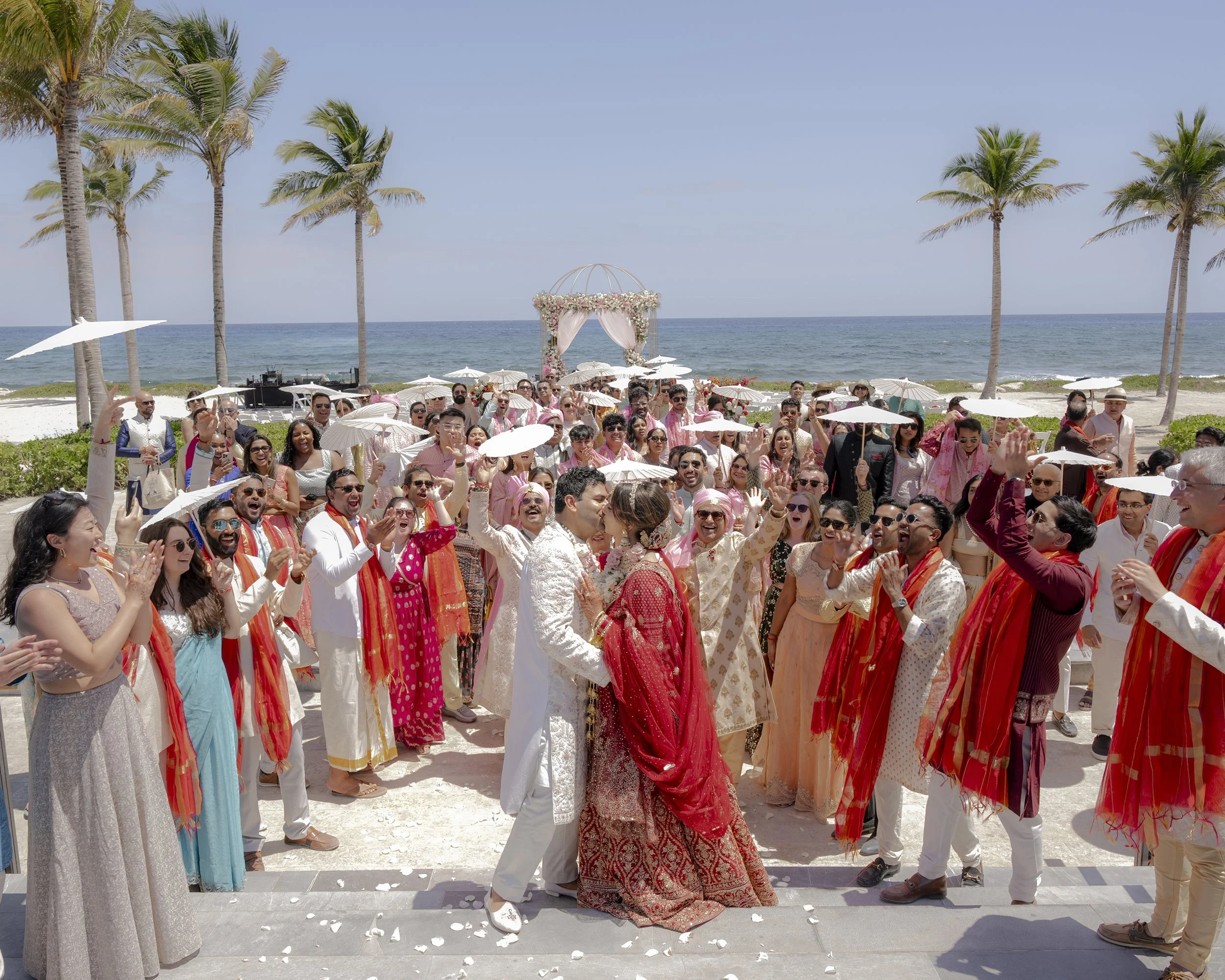 Aditi & Saubhav’s wedding in Tulum was a breathtaking celebration by the sea. The mandap, draped in soft blush fabric and adorned with cascading pastel blooms, stood gracefully against the ocean backdrop. The bride, radiant in red and gold, walked down the aisle to her favorite song, while the groom looked regal in ivory. Friends shaded the couple with dainty umbrellas as they circled the sacred fire under the golden sun. Later, everyone danced the night away under the Mexican skies, a perfect finale to a celebration filled with love, laughter, and togetherness.