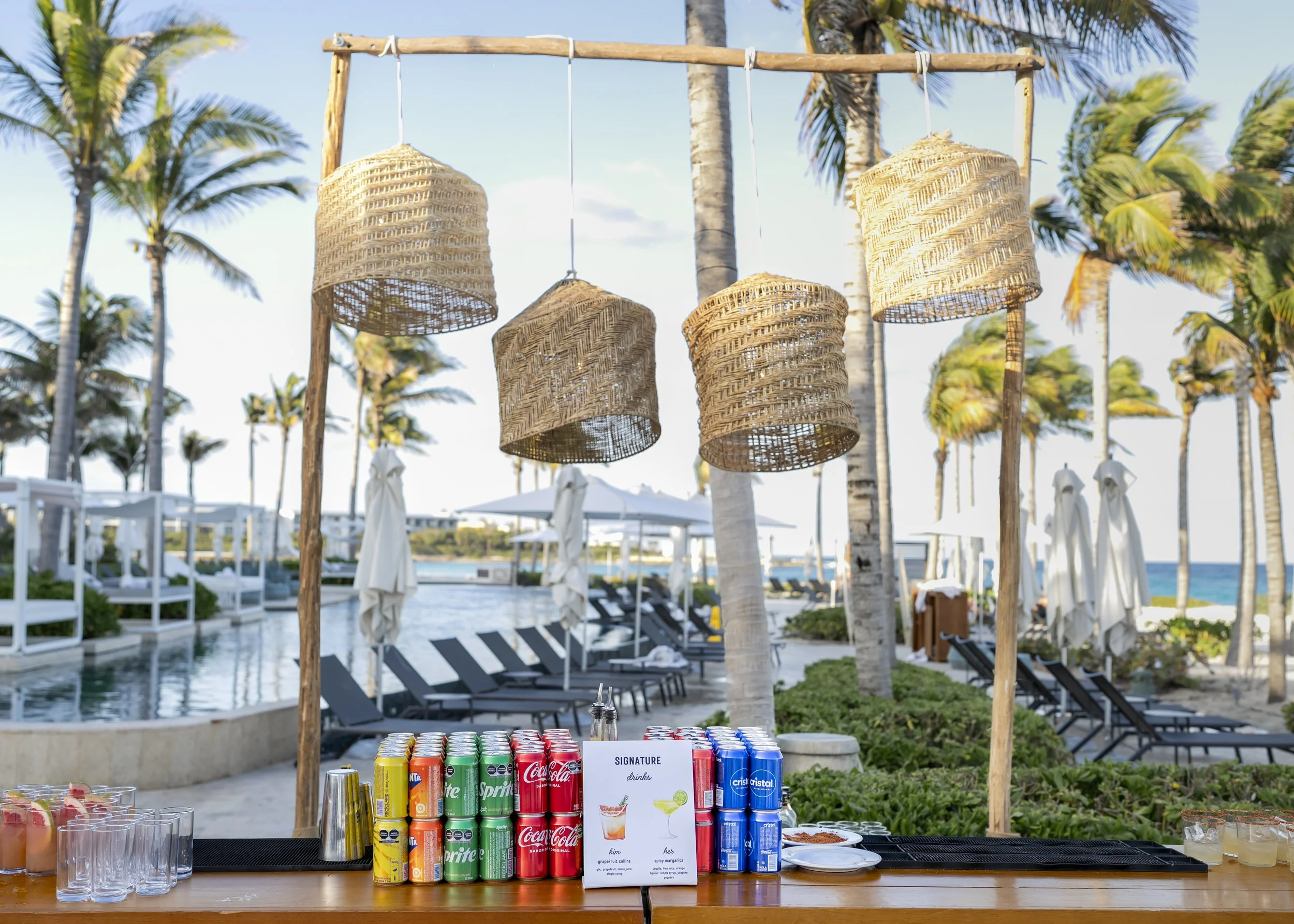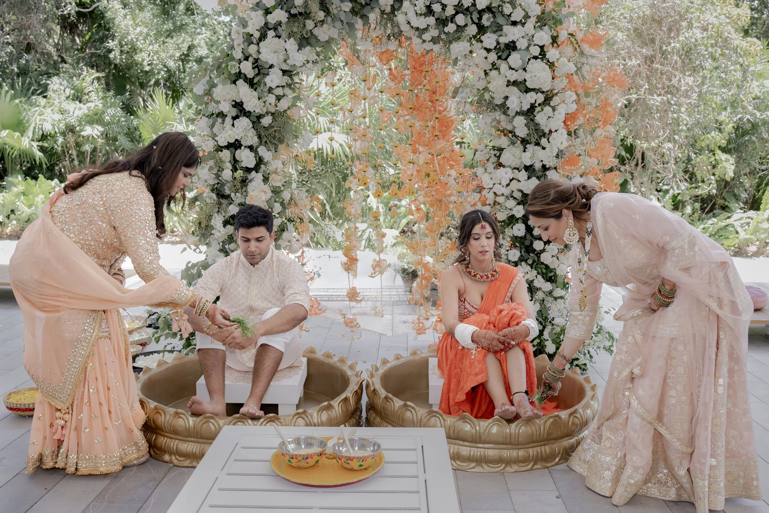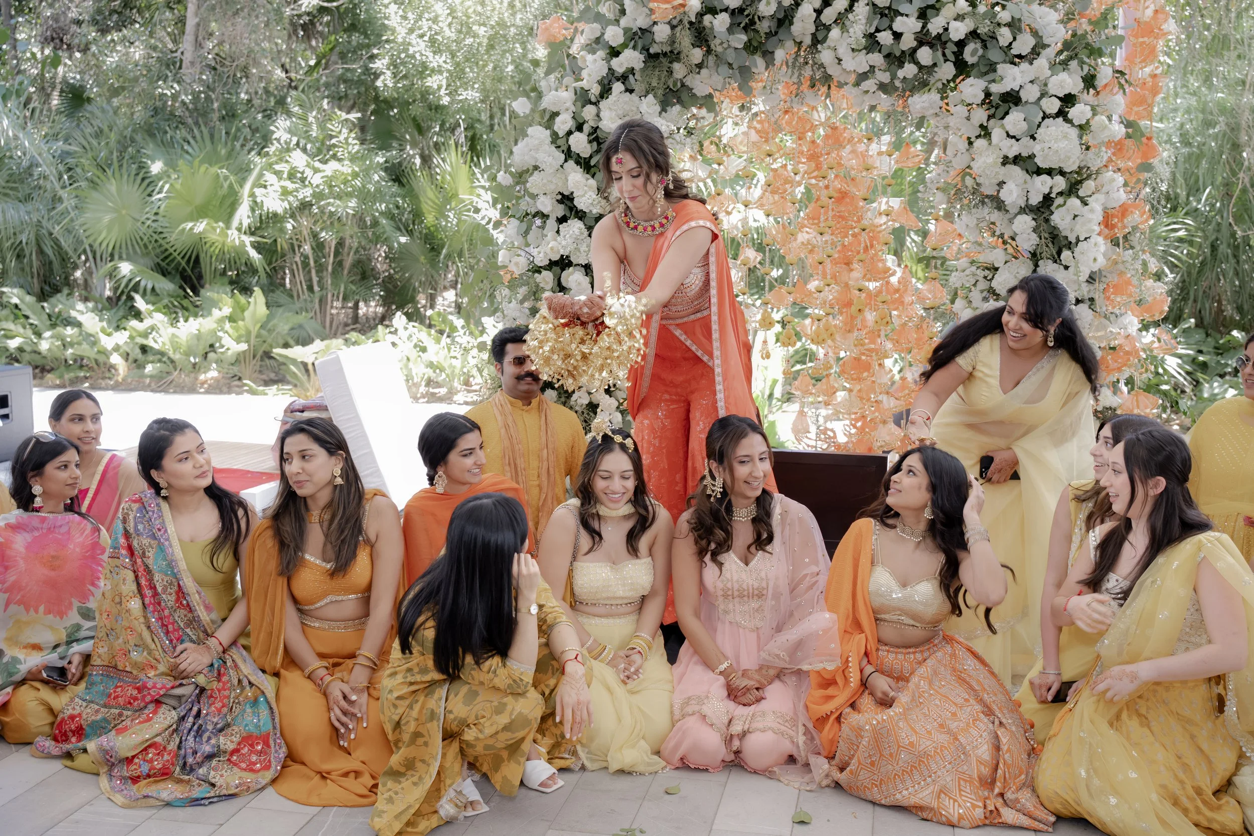 The Mehendi Fiesta in Tulum was a burst of color and charm, blending traditional elements with a breezy tropical spirit. Whimsical oversized pastel flowers, vibrant gift trays, and puja thalis added a festive touch, while cozy floor seating with cushions and rustic bar setups created a relaxed, joyful atmosphere. With palm trees swaying in the background and playful details at every corner, the celebration felt like a perfect mix of tradition and paradise