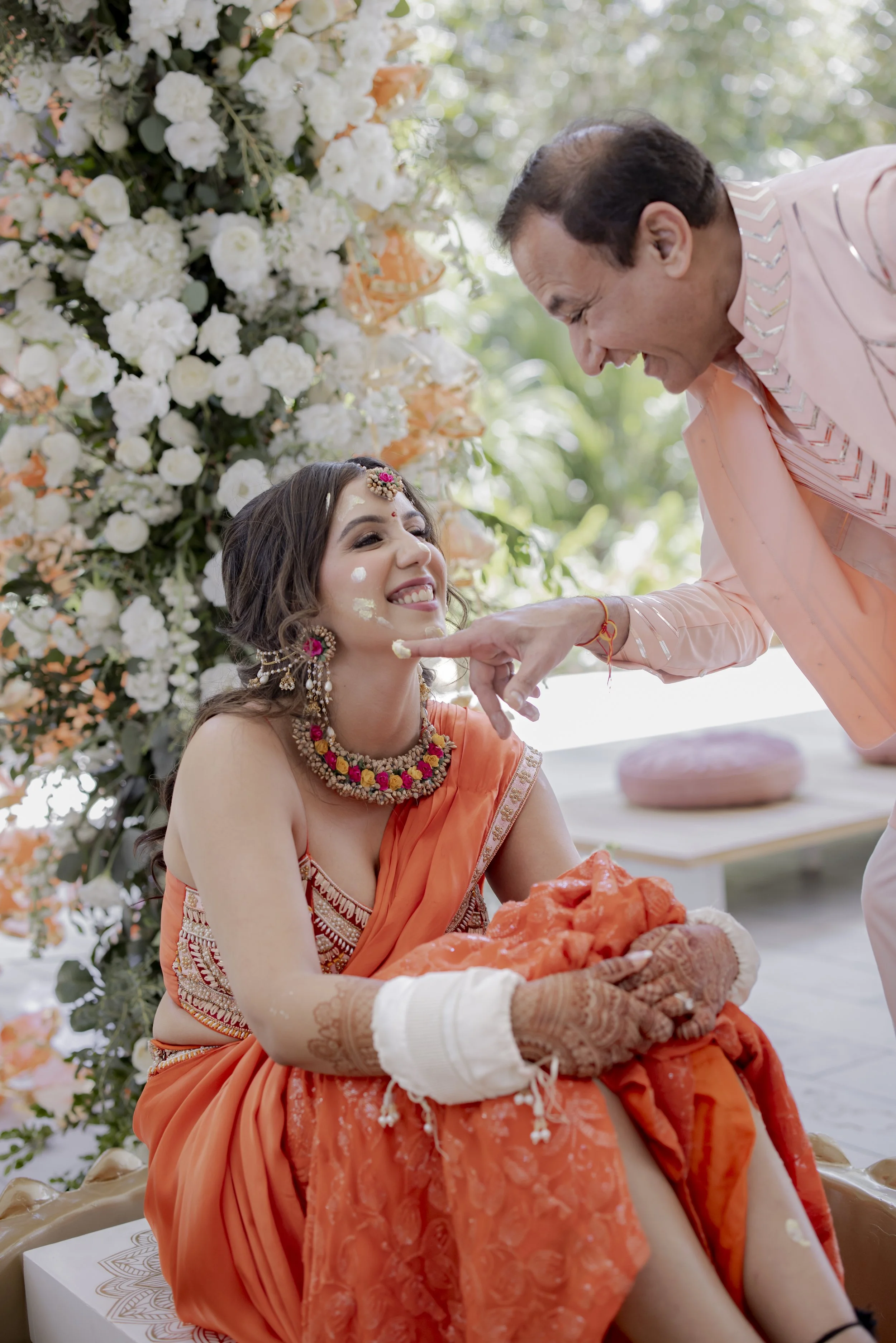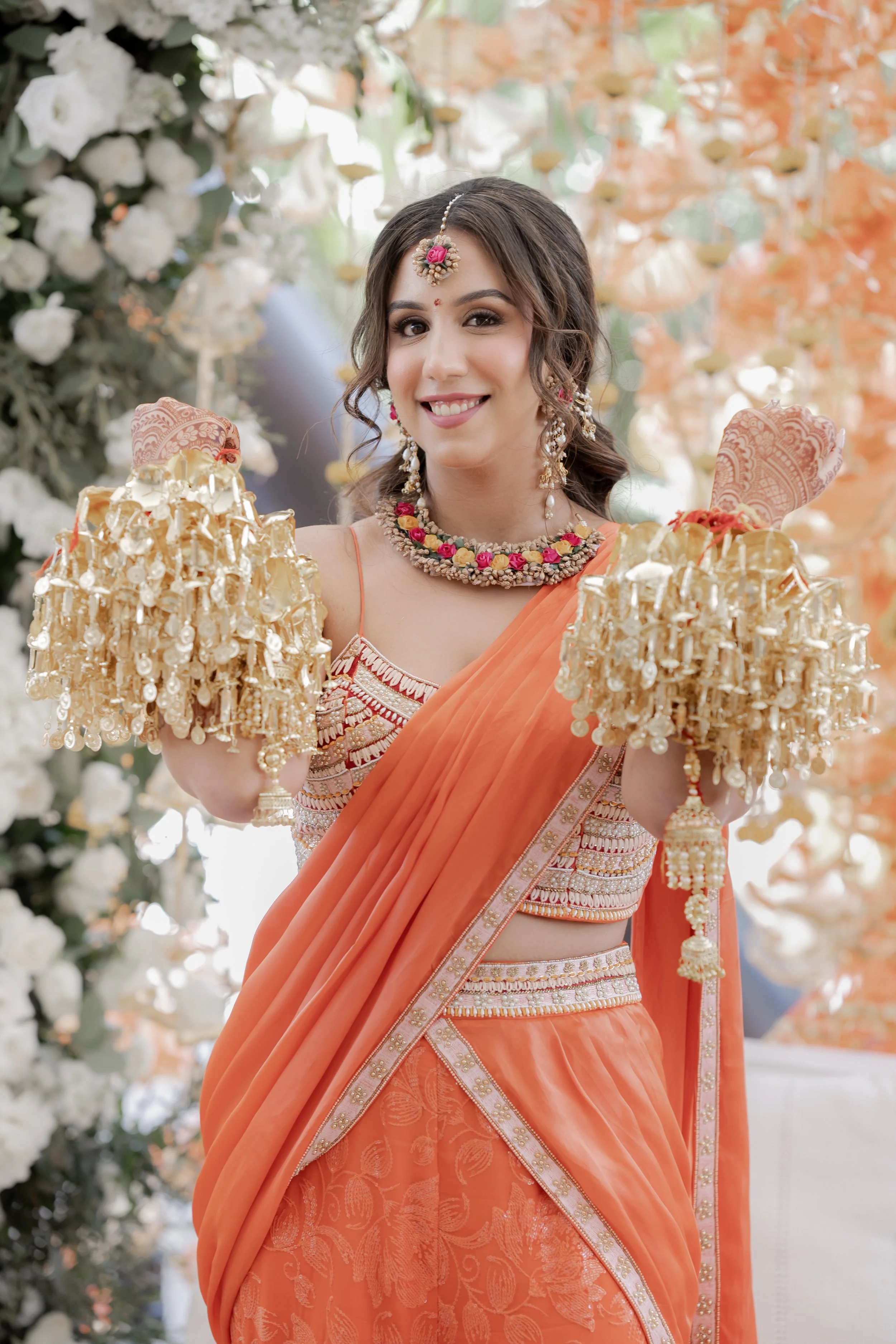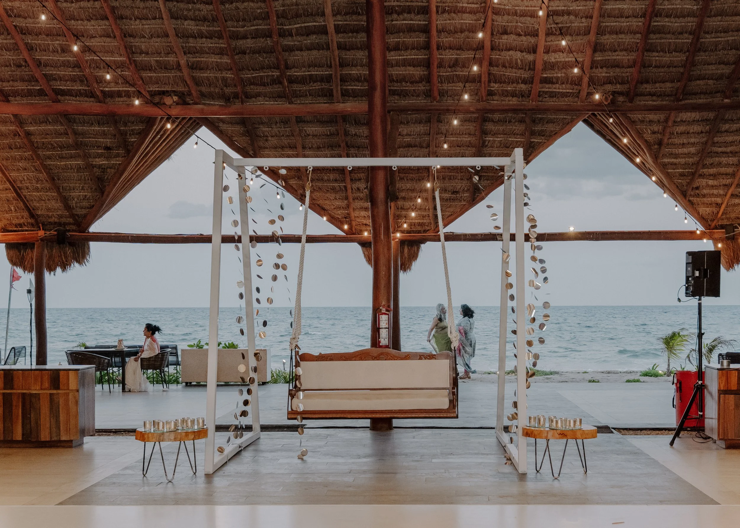 The Mehendi Fiesta in Tulum was a burst of color and charm, blending traditional elements with a breezy tropical spirit. Whimsical oversized pastel flowers, vibrant gift trays, and puja thalis added a festive touch, while cozy floor seating with cushions and rustic bar setups created a relaxed, joyful atmosphere. With palm trees swaying in the background and playful details at every corner, the celebration felt like a perfect mix of tradition and paradise