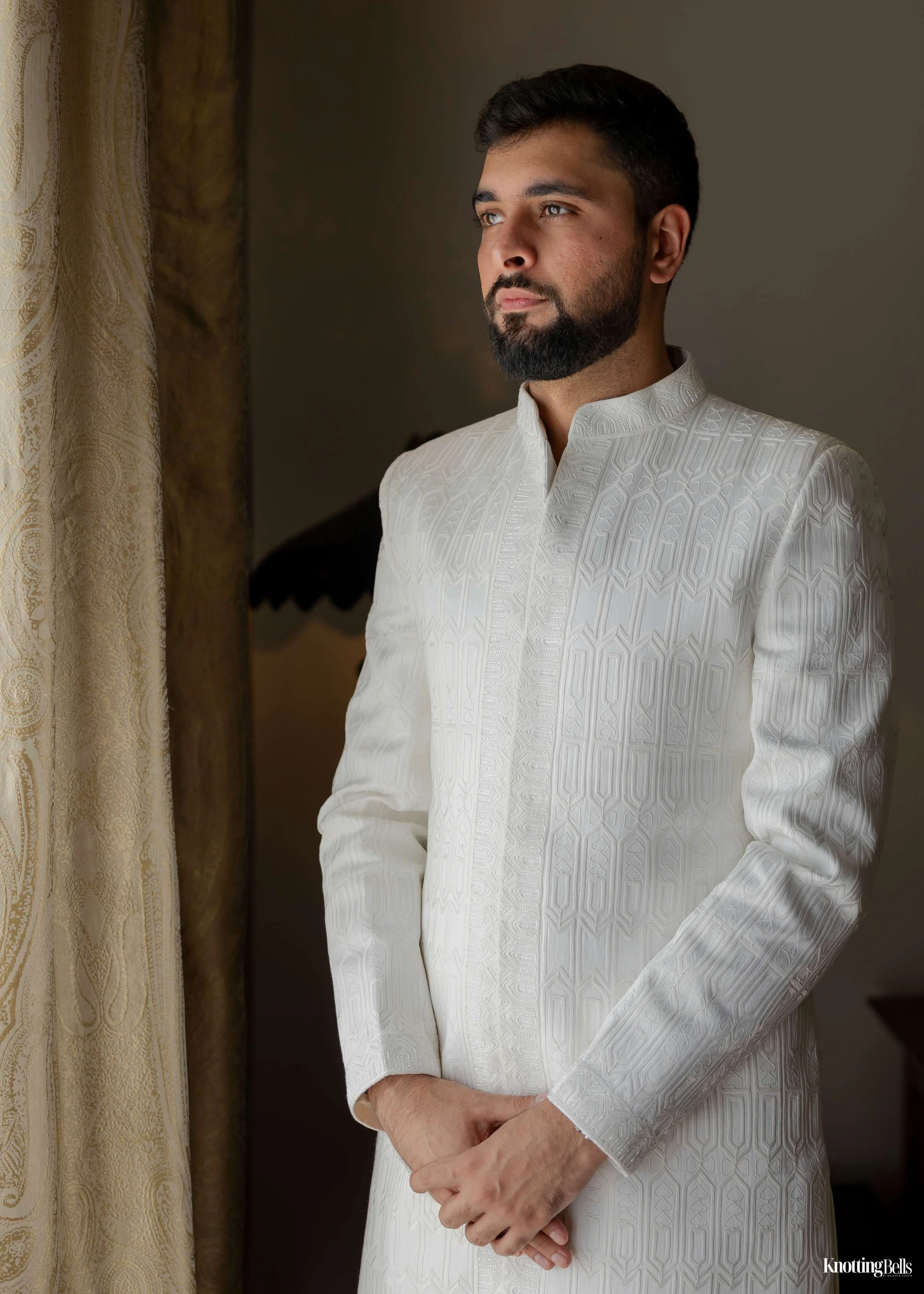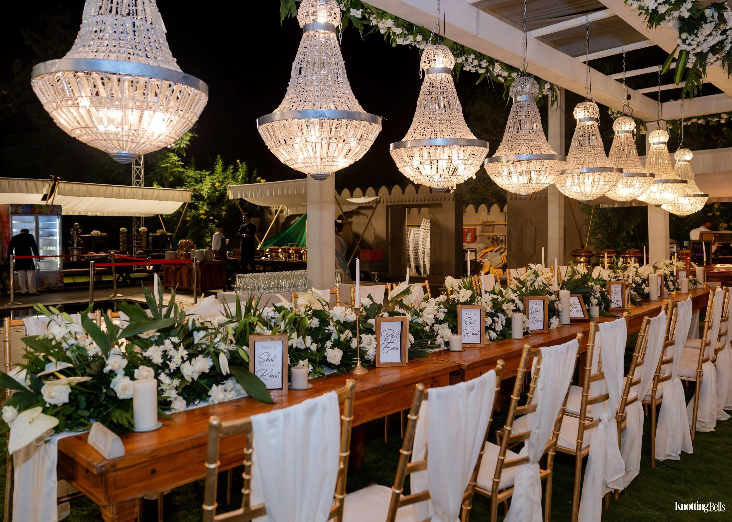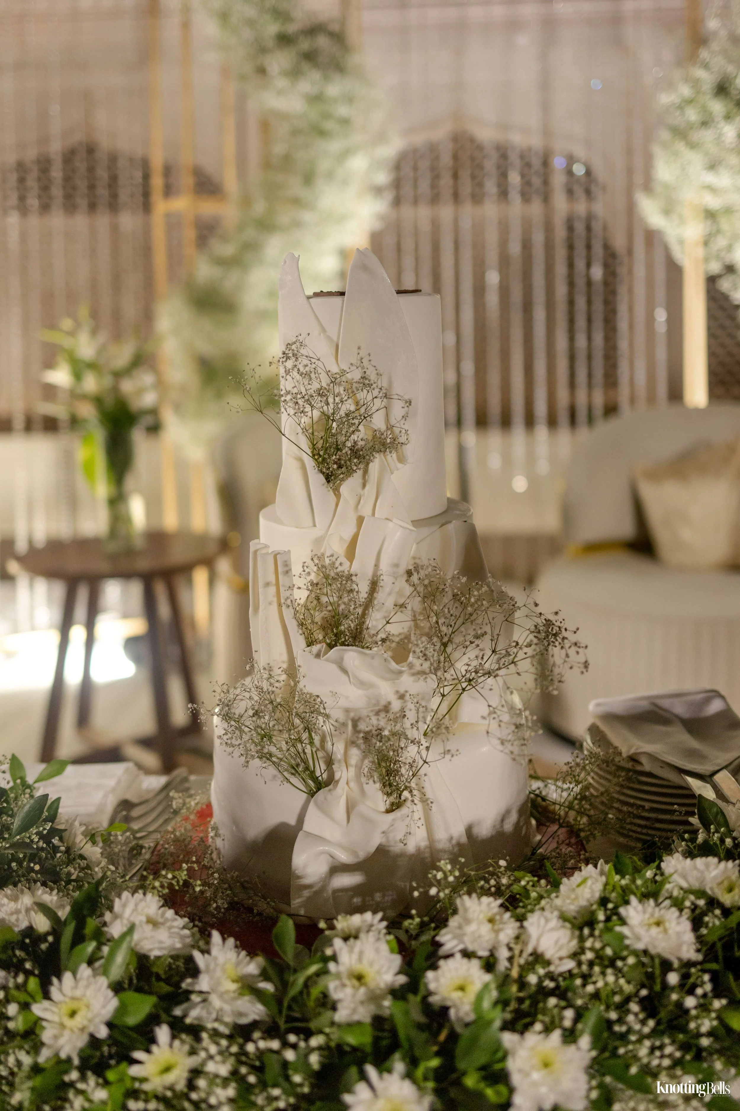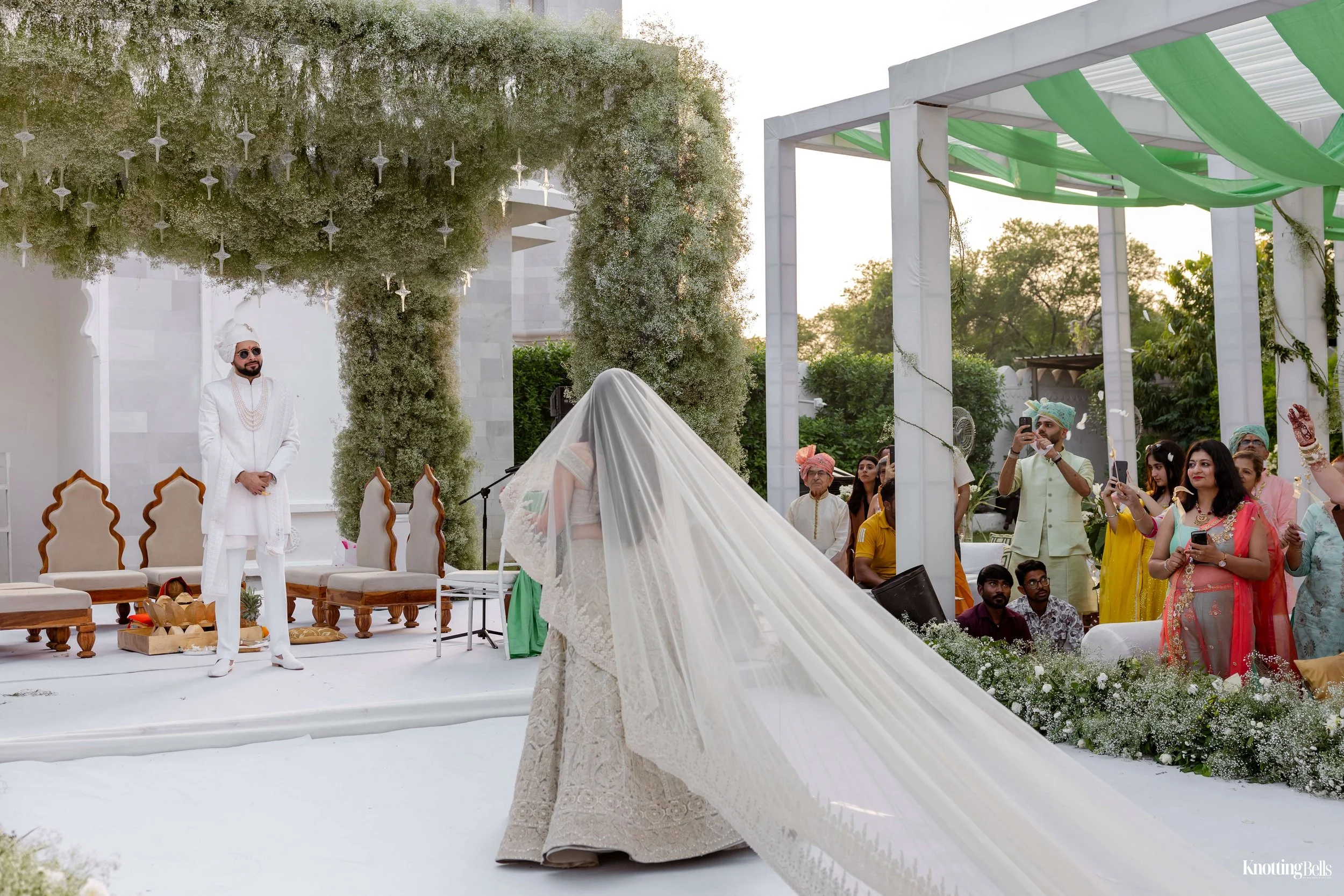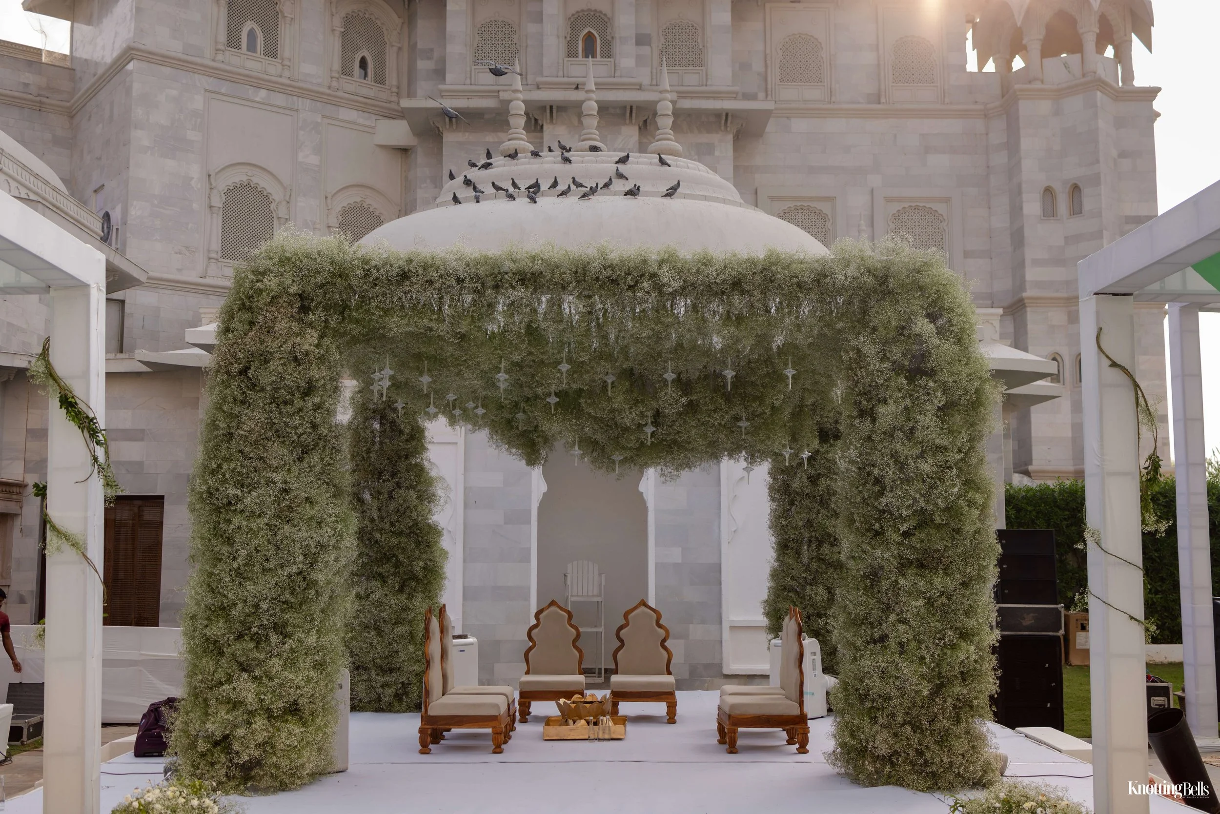 The Wedding unfolded in an ambience that felt like stepping into a dream—calm, graceful, and deeply aesthetic. The décor carried a softness that soothed the senses: a palette of whites and greens, kissed with gold, where every corner seemed to whisper serenity. Lounges of ivory and patterned cushions invited warmth and togetherness, The mandap was the heart of it all, a vision draped in clouds of baby’s breath, floating against the regal palace backdrop. Everything was curated to feel timeless yet modern.