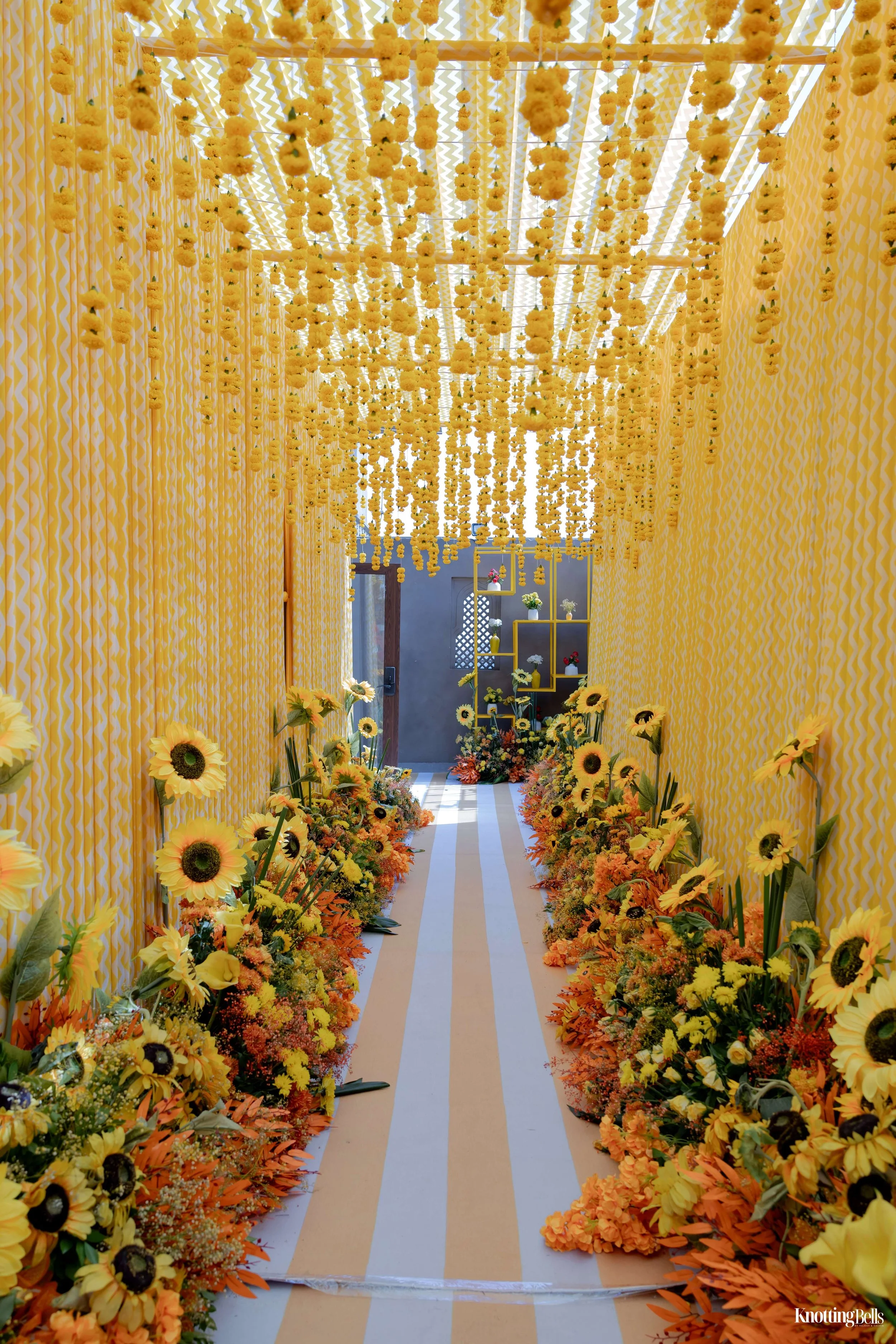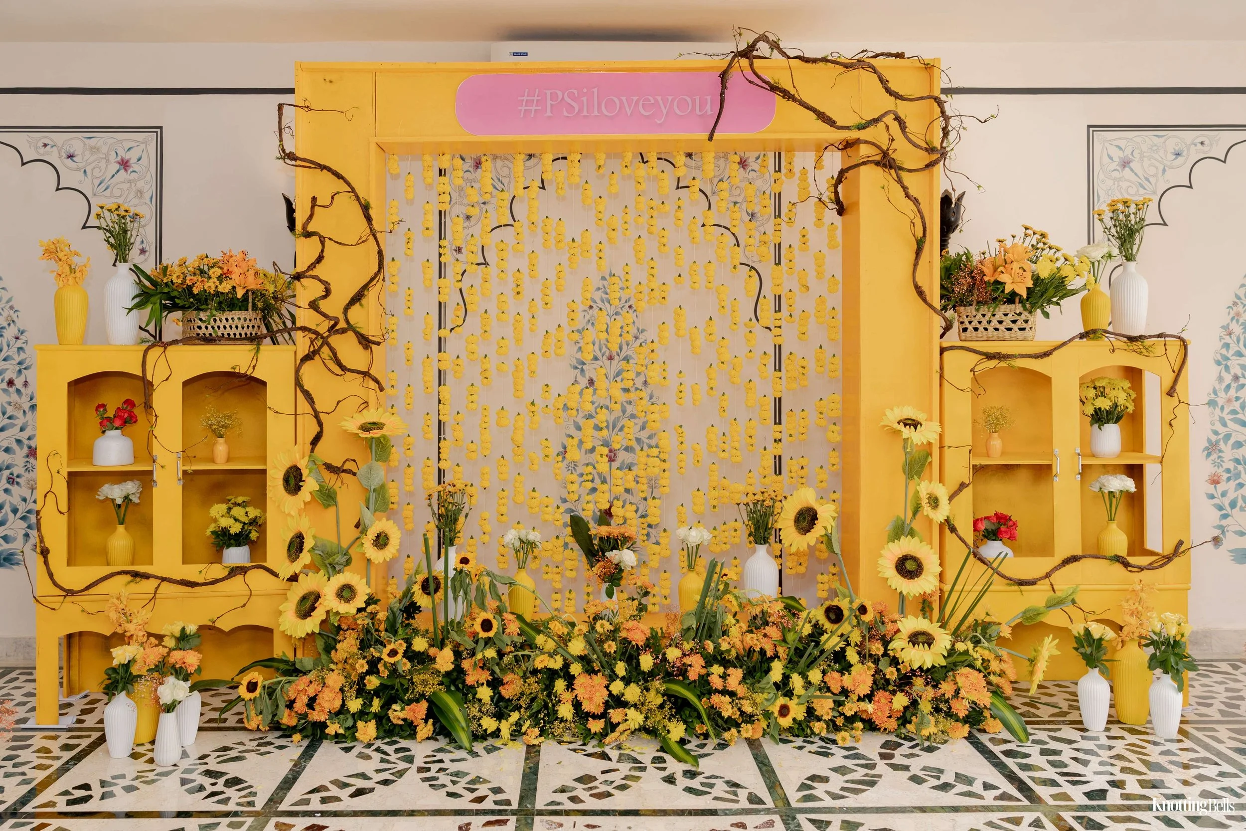 The Haldi ceremony was a vibrant affair, filled with the warmth of sunflowers and the laughter of loved ones. The decor was a stunning blend of tradition and modernity, with bright yellows and intricate details creating a cheerful, aesthetic and lively atmosphere that hints at the fun-filled nature of the event, where everyone were not just spectators but active participants. This was a day of laughter, love, and lighthearted fun, creating unforgettable memories